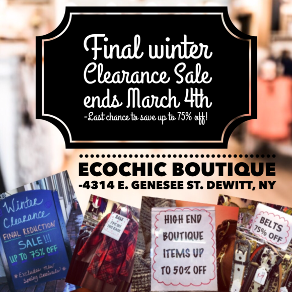 The store will open an hour late today due to bad road conditions. Open 12-6. Big discounts throughout the store, up to 50%...
